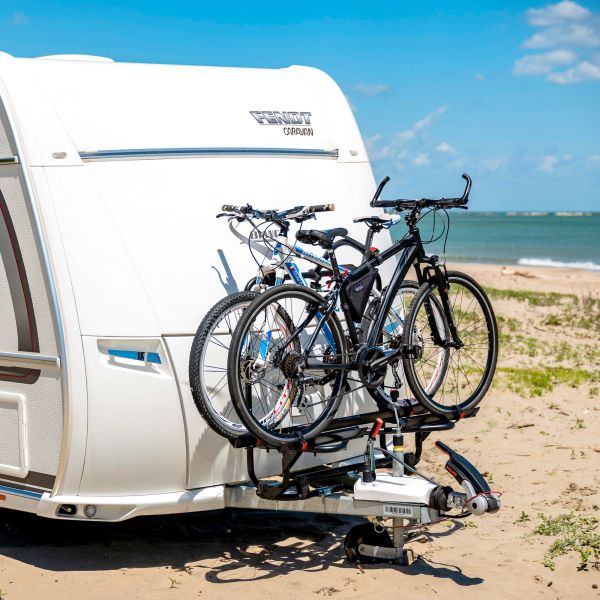 Der XL A Pro 300 ist mit verstärktem Bügel und der Rail Plus Schiene für E-Bikes ausgestattet. Eine dritte, optionale Schiene kann montiert werden. Durch den schnellen Abklappmechanismus des Bügels kann der Deichselkasten auch mit montierten Fahrrädern geöffnet werden. Bei Anbringung an der Standarddeichsel muss nicht gebohrt werden.
