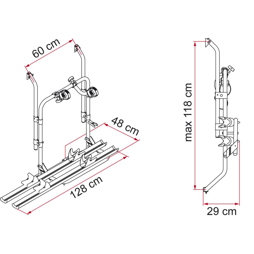 Fahrradträger für Kastenwagen mit doppelter Hecktür. Verstellbarer Achsenabstand von 58 cm auf 62 cm, für die Montage an verschiedenen Hecktüren. Mit nur 34 mm breiter; obere Wandhalterung zum Verschrauben. Die Hecktür kann geöffnet werden ohne die Fahrräder abzunehmen.