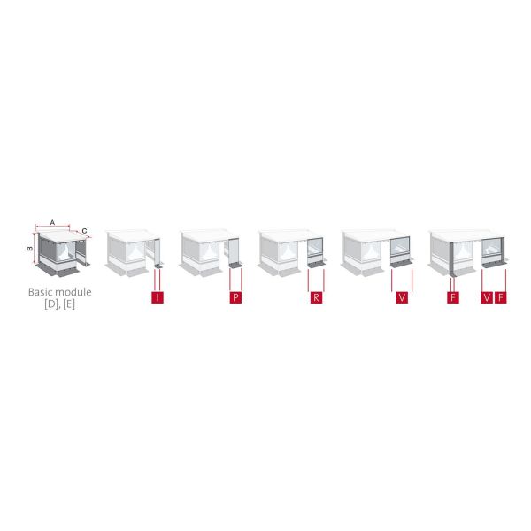 Frontteil: Ist Ihre Markise 360 cm lang oder länger, benötigen Sie das Privacy Room CS Light XL 310. Außerdem zusätzlich noch eine Frontwanderweiterung, deren Größe sich nach der Länge Ihrer Markise richtet.