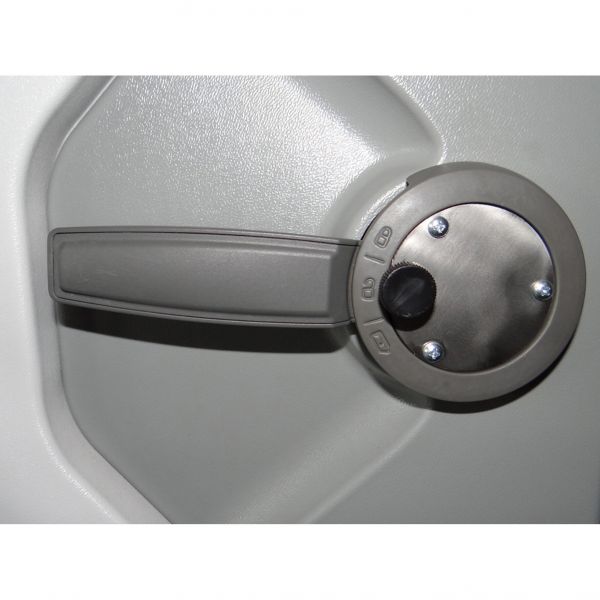 Das Fahrzeugemblem auf der Mitte des Innengriffs wird durch die Türsicherung ersetzt. Durch das Eindrehen der Sicherungsschraube im geschlossenen Zustand wird die Verriegelung blockiert, so dass ein Öffnen von außen nicht möglich ist. Türsicherung passend für einteilige Türen von Knaus ab Baujahr 2017.