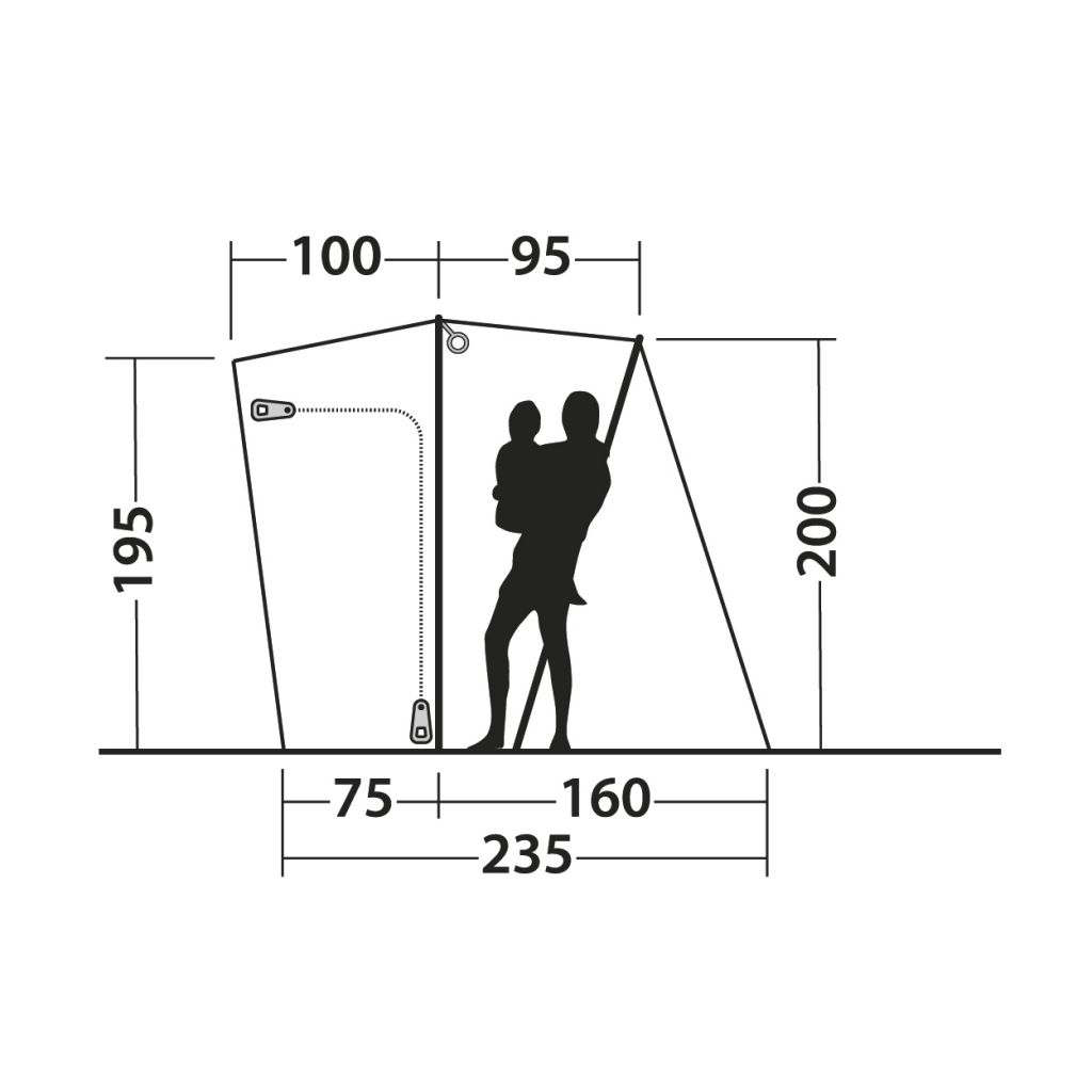 Das freistehende Vorzelt benötigt nur wenig Stellfläche und ist sehr kompakt und leicht. Dank zwei leichten Alu-Gestängebögen steht es mit wenigen Handgriffen. Der hochgezogene Vorzeltboden, der mit Klett an der Zeltwand abdichtet, kann komplett entnommen werden, um z. B. Packmaß und Gewicht nochmal zu reduzieren. Mehrere Netzfenster mit Zip-Up-Vorhängen sorgen für eine gute Belüftung. Im Schleusenbereich befinden sich gegenüberliegende Seiteneingänge, die den Zugang zu Van und Zelt ermöglichen.