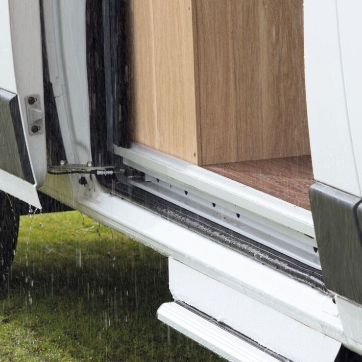Für einen trockenen Eingangsbereich sorgt beim Fiat Ducato der Regenabweiser. So kommt selbst bei leichtem Wind kein Regenwasser ins Fahrzeug und mindert gleichzeitig die Rutschgefahr.