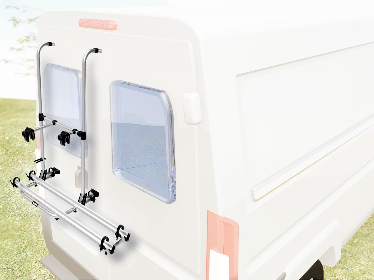Kompakter Träger für Campervans, kann wahlweise auf der rechten oder linken Hecktüre montiert werden. Er hat eine Tragkraft von 35 kg (max. 19 kg je Schiene), die Fahrrad-Schienen können versetzt montiert werden, so dass die Fahrräder in der Mitte der Heckwand fixiert sind. Er ist geeignet für die Aufnahme von 2 Fahrrädern.